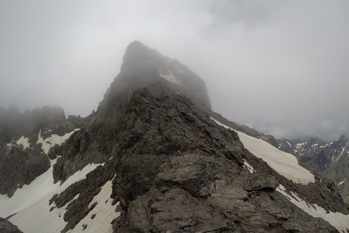 Avançant prudemment, nous nous engageons dans un raide couloir qui s’avère ne pas être le bon. Redescente et miracle nous apercevons quelques cairns qui nous conduiront jusqu’au sommet. L’arrête et le sommet sont assez aériens mais les nuages nous épargnent au moment de commencer la descente. Là encore, merci les crampons car nous avons pu traverser en toute sécurité un névé bien pentu.
